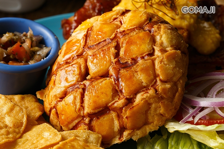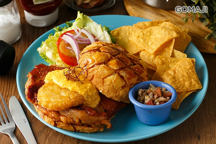 不同於美式漢堡的口感,香酥菠蘿麵包風味更新穎!蓬鬆軟綿的菠蘿麵包,夾進多汁鮮美的雞腿肉及主廚特製的金沙鹹蛋風味調醬,大口品嚐,肉嫩味香,鹹蛋濃郁沙沙的滋味,好特別啊 ~ 與一旁玉米脆片、生菜沙拉搭配享用,飽足又滿意啊!