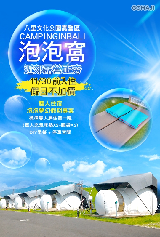 位於八里文化公園露營區,跳脫傳統露營方式,運用最低的能源和最少的材料,讓人與環境有近距離的互動,創造出泡泡帳篷!在繁忙的生活中,偶爾也要停下腳步,好好的放鬆,看看不同地方的美景,發現生活中更多美麗的事物!放自己一個假,來趟露營輕旅行,一起遠離所有電子產品,體驗戶外野宿的樂趣吧!