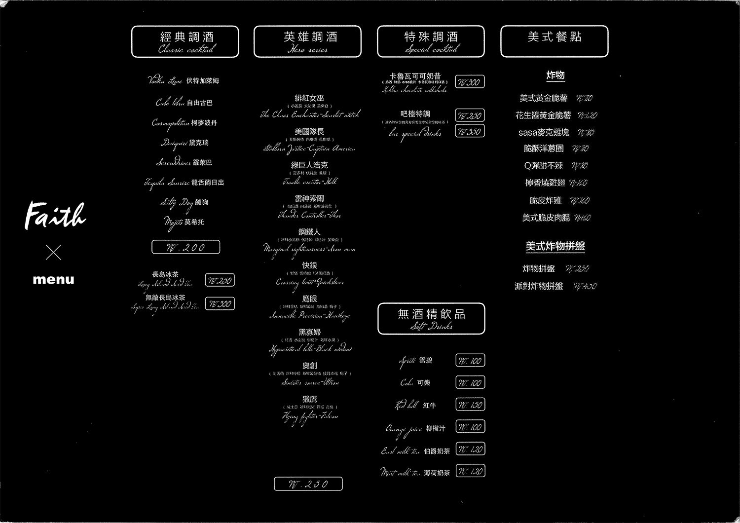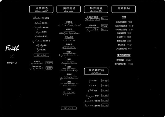 【Faith Bar】美式餐酒館位於育樂街200號!親民的價位,舒適的空間,各式桌遊,精品調酒,提供如同家一樣舒適的娛樂空間,歡迎麻吉帶著三五好友前來共度美好夜晚時光!這回只要130元即可享有200元等值消費,特別推薦:鐵板麵、蝦餅、松阪豬、脆皮炸雞、炸物拼盤、Special Vodka Lime、柯夢波丹(未成年請勿飲酒)!