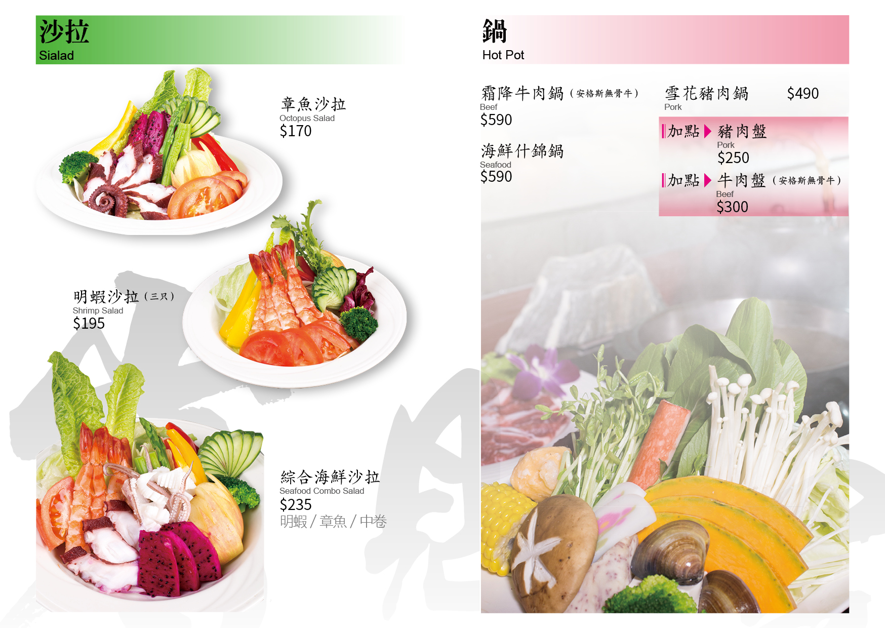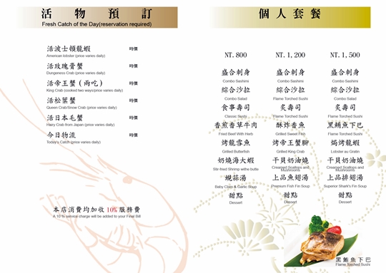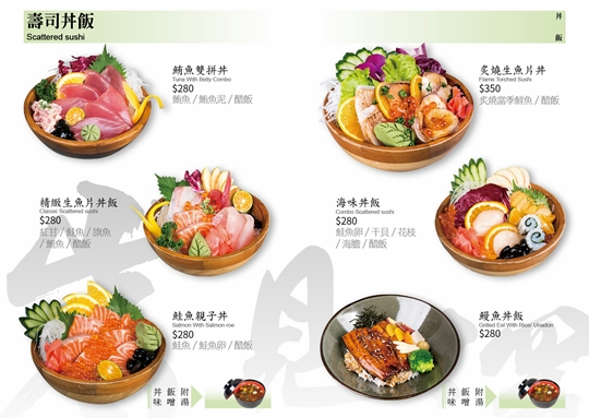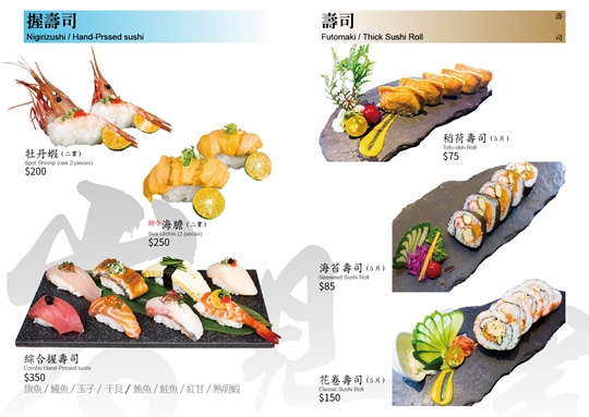 (酒水不適用) 特別推薦:火焰牛、宮保雞丁、麻辣水煮魚、岩見澤冷麵、綜合握壽司、炙燒生魚片丼、精緻生魚片丼、燜鴨兩吃
