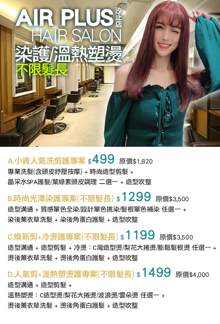 A.小資人氣洗剪護專案 / B.時尚光澤染護專案(不限髮長) / C.煥新剪+冷燙護專案(不限髮長) / D.人氣剪+溫熱塑燙護專案(不限髮長)