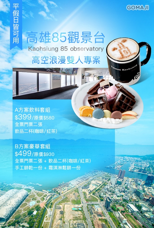 仙山秀水盡收眼底,居高臨下體驗被愛河緊緊擁著的美麗港都,如此地壯觀磅礡,又蘊著一絲絲婉約柔順的脫俗氣質,卻又有獨特的現代科技感深融其中,與台北俯瞰的高樓景色截然不同。本次推出高空浪漫雙人專案,平假日皆可使用。