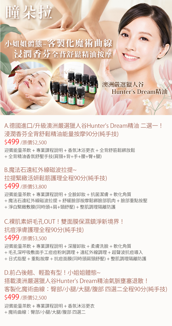 A.德國進口/升級澳洲嚴選獵人谷Hunter's Dream精油 二選一!浸潤香芬全背舒鬆精油能量按摩90分(純手技) / B.魔法石遠紅外線磁波拉提~拉提緊緻活妍鬆筋護理全程90分(純手技) / C.裸肌素妍毛孔OUT!雙面膜保濕鎮淨新境界!抗痘淨膚護理全程90分(純手技) / D.前凸後翹、輕盈有型!小姐姐體態~搭載澳洲嚴選獵人谷Hunter's Dream精油氣脈壅塞退散!客製化魔術曲線:臀部/小腿/大腿/腹部 四選二全程90分(純手