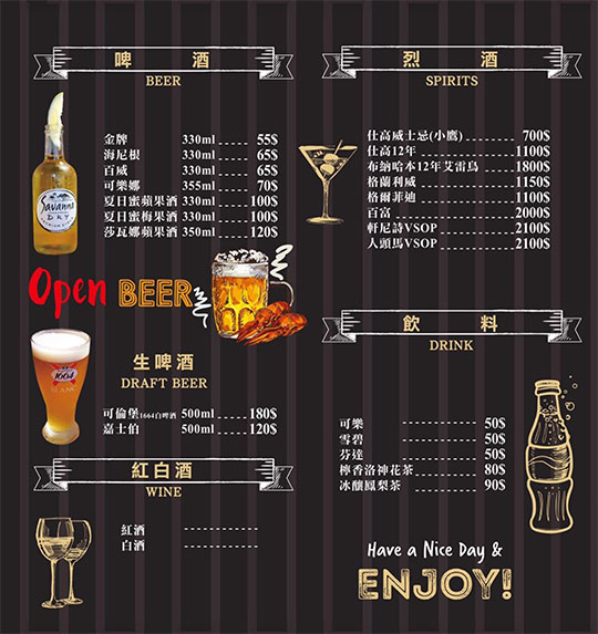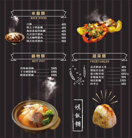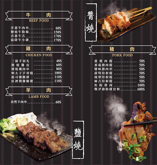 特別推薦:戰斧豬肋排套餐、鯖魚一夜干、手工天婦羅、塩味干貝燒、十全藥膳雞湯、明太子手羽燒、起司雞腿排、霜降牛小排等