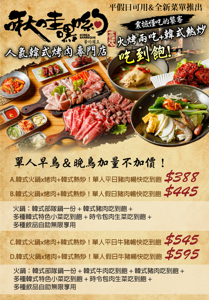 D.早鳥&晚鳥加量不加價!韓式火鍋x烤肉+韓式熱炒!單人假日牛豬暢快吃到飽