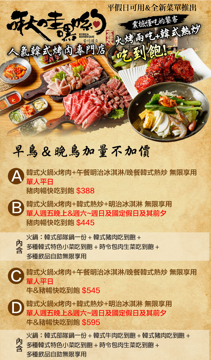 A.早鳥&晚鳥加量不加價!韓式火鍋x烤肉+午餐明治冰淇淋/晚餐韓式熱炒 無限使用!單人平日豬肉暢快吃到飽/B.早鳥&晚鳥加量不加價!韓式火鍋x烤肉+韓式熱炒+明治冰淇淋!單人週五晚上&週六~週日及國定假日及其前夕豬肉暢快吃到飽/C.早鳥&晚鳥加量不加價!韓式火鍋x烤肉+午餐明治冰淇淋/晚餐韓式熱炒 無限使用!單人平日牛豬暢快吃到飽/D.早鳥&晚鳥加量不加價!韓式火鍋x烤肉+韓式熱炒+明治冰淇淋!單人週五晚上&週六~週日及國定假日及其前夕牛豬暢快吃到飽