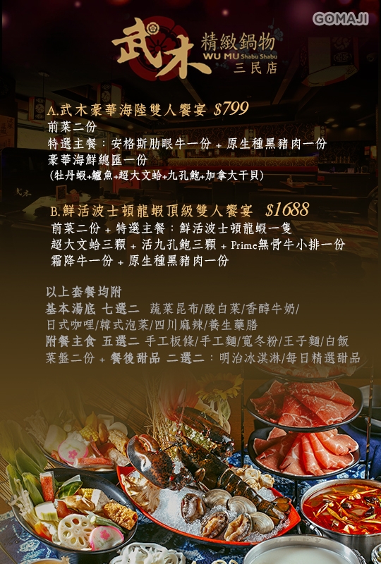 真正超低價,超優惠的生猛海鮮就在【武木鍋物(三民店)】!選擇B方案的麻吉即可享有每日限量的鮮活波士頓龍蝦,搭配超大文蛤、活九孔鮑,絕對讓人感到物超所值!