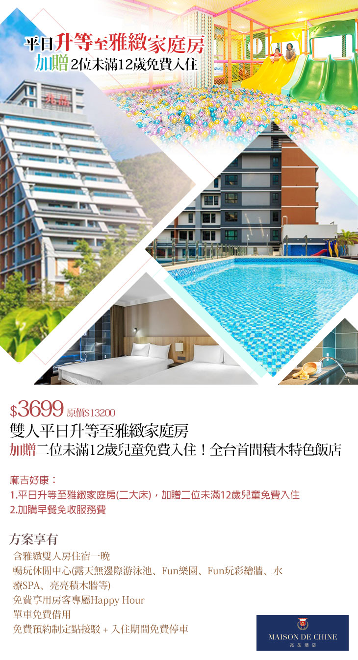 麻吉好康:1.平日升等至雅緻家庭房(二大床),加贈二位未滿12歲兒童免費入住