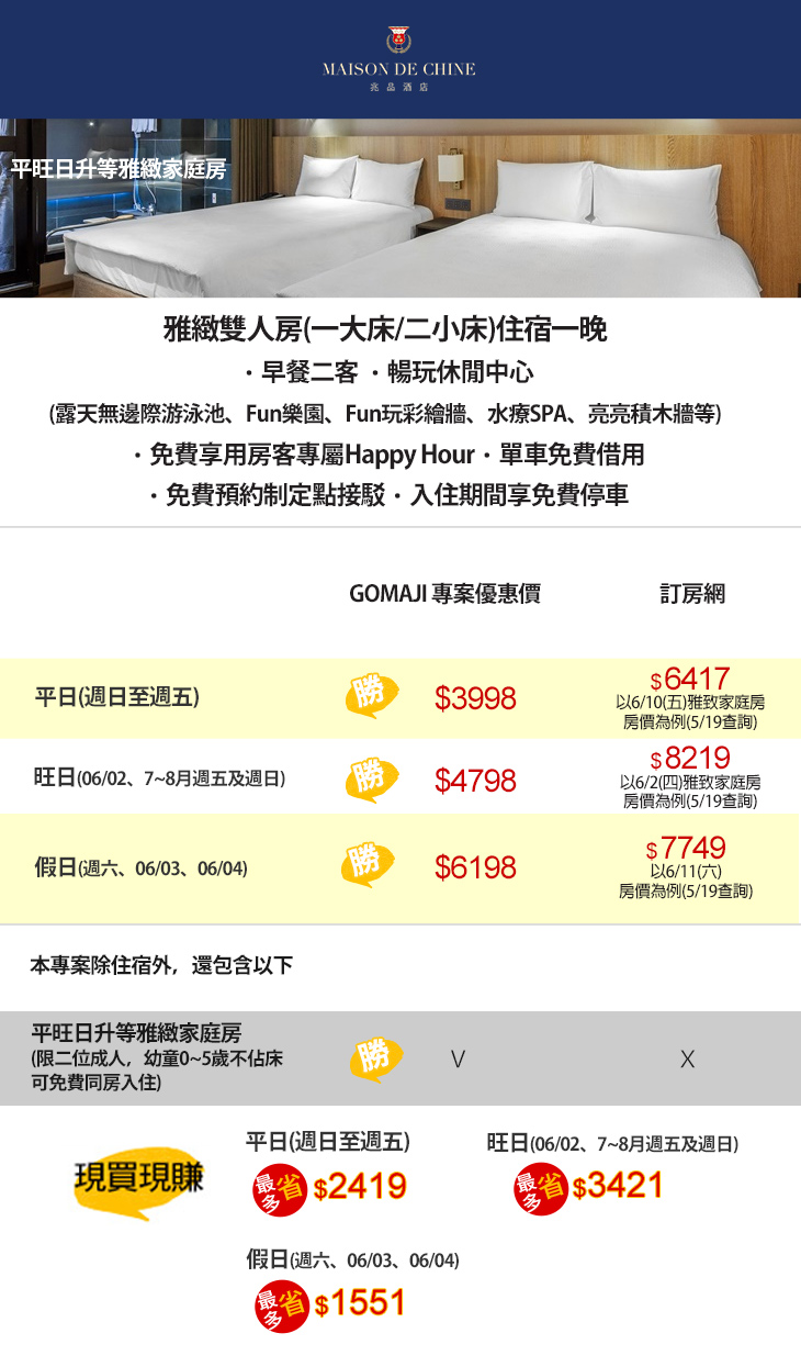 麻吉提醒:疫情期間,暢玩9樓休閒中心(露天無邊際游泳池、Fun樂園、Fun玩彩繪牆、水療SPA、亮亮積木牆等),設施使用請依官網最新訊息公告為主;泳池需著泳衣、泳帽方可入內使用。
