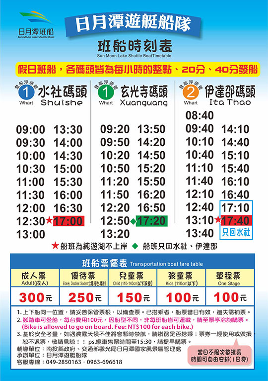 水社碼頭末班船 17:00;玄光碼頭末班船 17:20;伊達邵碼頭末班船17:40
