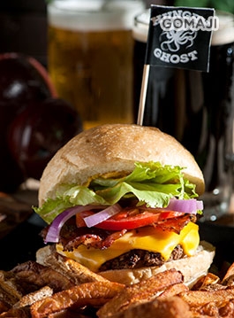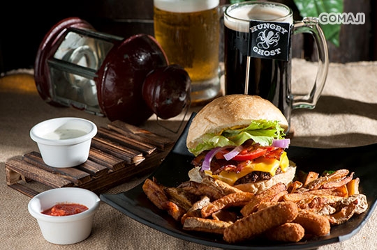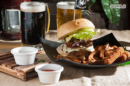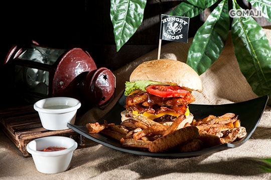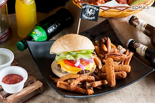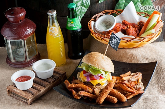 手工牛肉漢堡:培根香濃起士堡/香濃起士堡/碳烤洋蔥圈堡/乳酪炒菇堡 四選一 + 手切薯條一份 + 莫扎瑞拉起士條一份 + 餓鬼招牌水牛城辣雞翅一份 + 飲料:可樂/雪碧/芬達/蘋果汁 四選二