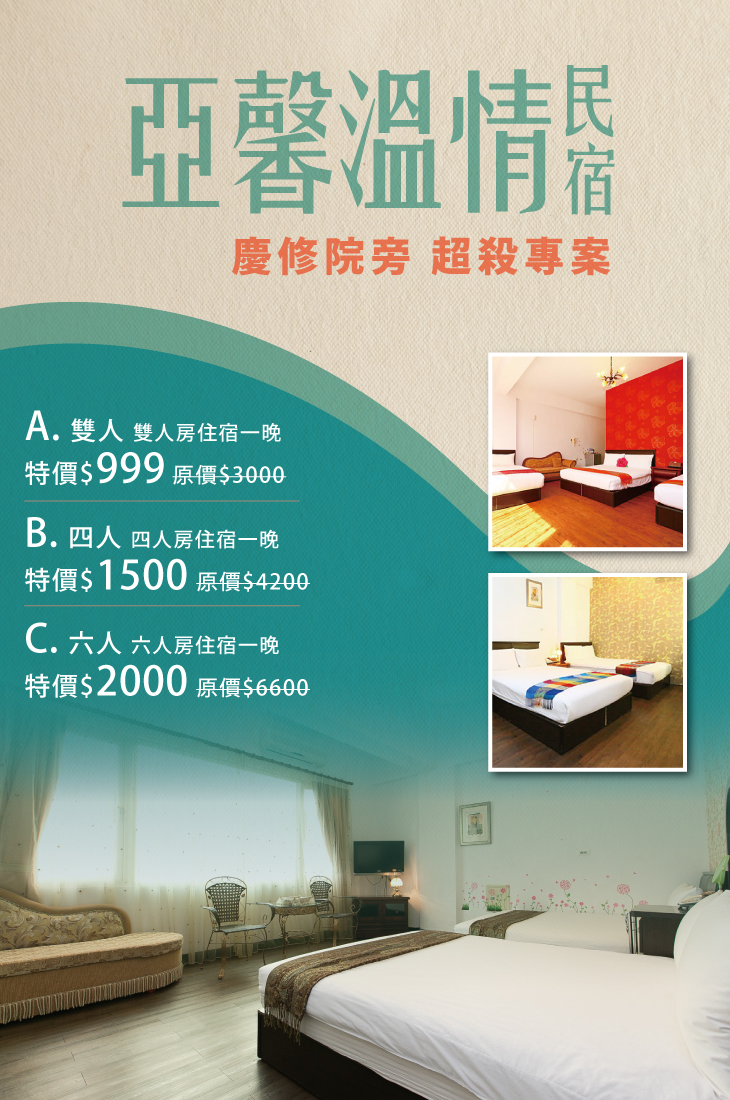 若是一家同行的天倫之旅、或是麻吉姊妹們的熱血出遊,也不用擔心人多沒地方睡,民宿方面也提供了四人的多樣房型供您做選擇,讓您一行人共享歡欣舒適的假期~