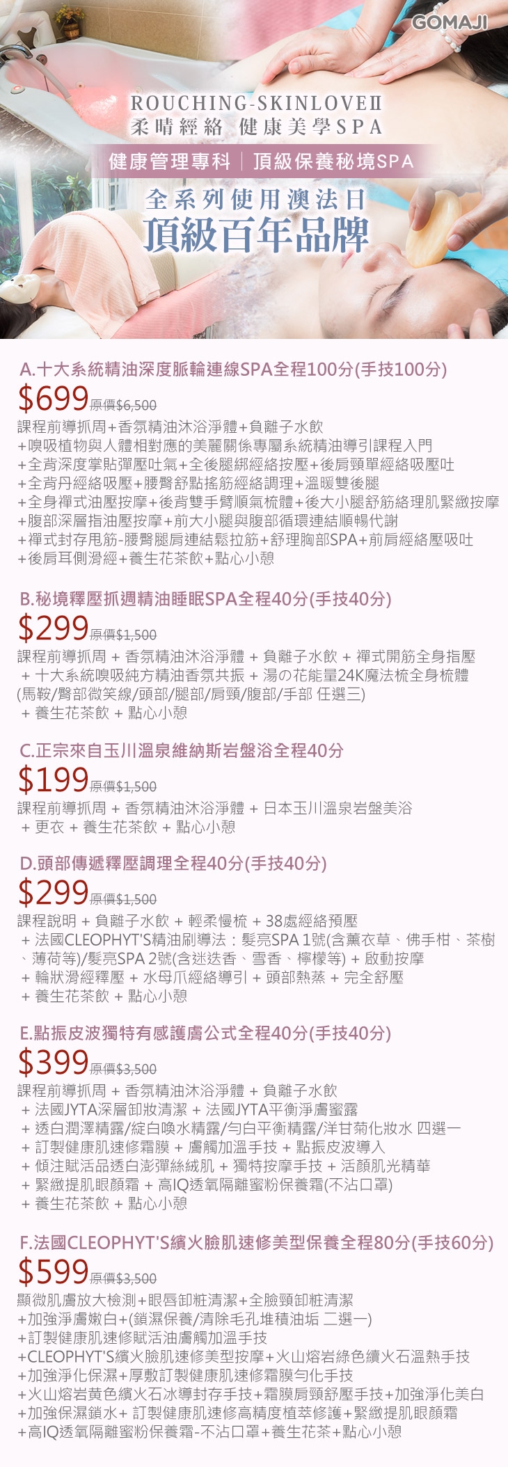 A.十大系統精油深度脈輪連線SPA全程100分(手技100分) / B.秘境釋壓抓週精油睡眠SPA全程40分(手技40分) / C.正宗來自玉川溫泉維納斯岩盤浴全程40分 / D.頭部傳遞釋壓調理全程40分(手技40分) / E.點振皮波獨特有感護膚公式全程40分(手技40分) / F.法國CLEOPHYT'S繽火臉肌速修美型保養全程80分(手技60分)
