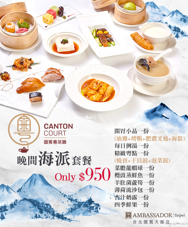 從開放式的廚房,欣賞主廚現場表演拿手料理,再到優雅格調、現代感十足的裝潢設計,以及精湛的廣東名菜,國賓粵菜廳堪稱是台北都會地區數一數二的精緻粵菜餐廳。在此可以享受到味道細膩含蓄的精緻粵菜美食,不論是海鮮料理或港式點心,都以傳統食材及手法新鮮現做而成,也讓美食體驗臻至盡善盡美的境界。