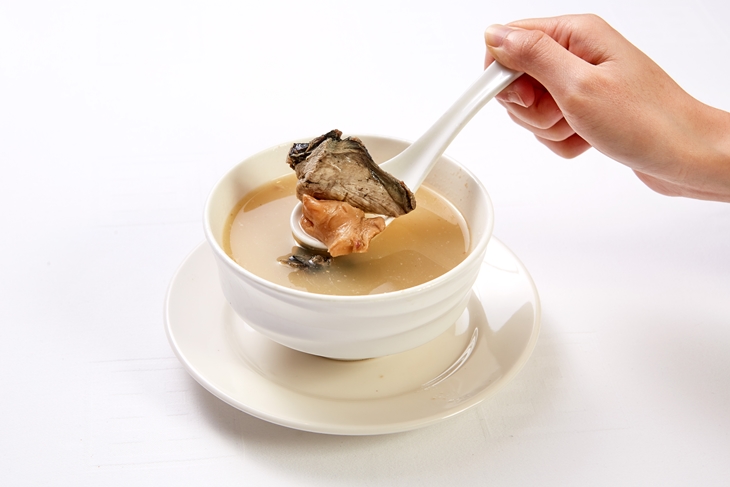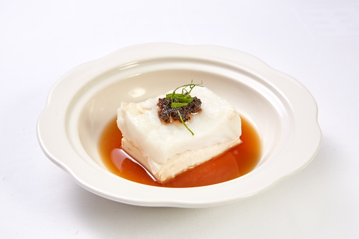 選用肉厚而豐的進口龍鱈(俗名),搭配豆香濃郁的板豆腐「白玉鋪底」,並以廣東特有的欖豉醬提味,清蒸手法最能突顯食材的新鮮度,鹹香的欖豉醬最適合與易吸附入味的魚類搭配,讓海鮮風味層次更提升。細嫩雪白的魚肉搭配濃色醬汁,誘人食慾大開。