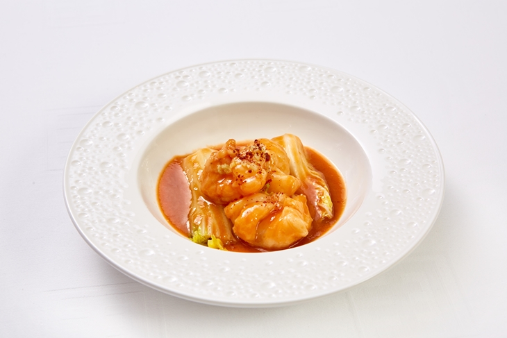 將鮮嫩娃娃菜與熬煮四小時而得的濃郁龍蝦湯共同煨煮,再加入彈牙紮實的進口龍蝦,一同釋放海味精華,最後以花雕酒賦味提鮮。滑嫩娃娃菜鋪底,Q彈龍蝦肉置於其上,均勻裹上馥郁飽滿的龍蝦海鮮湯汁,入口的鮮美滋味令人難忘。