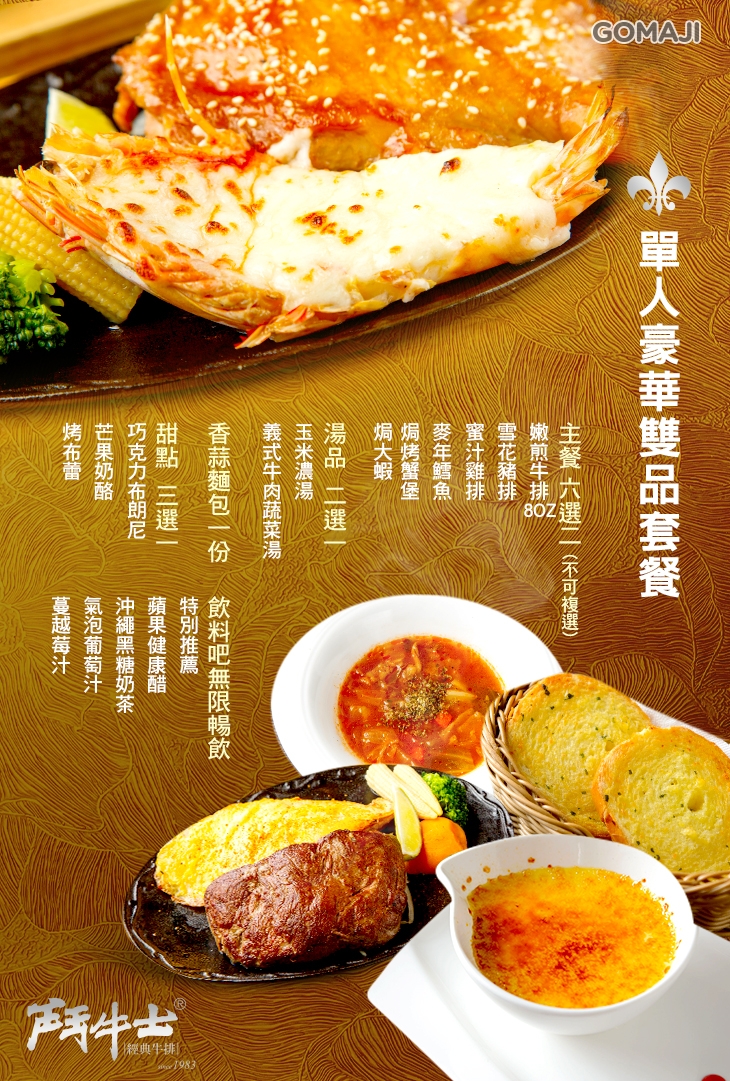 主餐 : 嫩煎牛排8oz/雪花豬排/蜜汁雞排/麥年鱈魚/焗烤蟹堡/焗大蝦 六選二(不可複選) + 湯品 : 玉米濃湯/義式牛肉蔬菜湯 二選一 + 香蒜麵包一份 + 甜點 : 巧克力布朗尼/芒果奶酪/烤布蕾 三選一 + 飲料吧無限暢飲(特別推薦 : 蘋果健康醋、沖繩黑糖奶茶、氣泡葡萄汁、蔓越莓汁等)