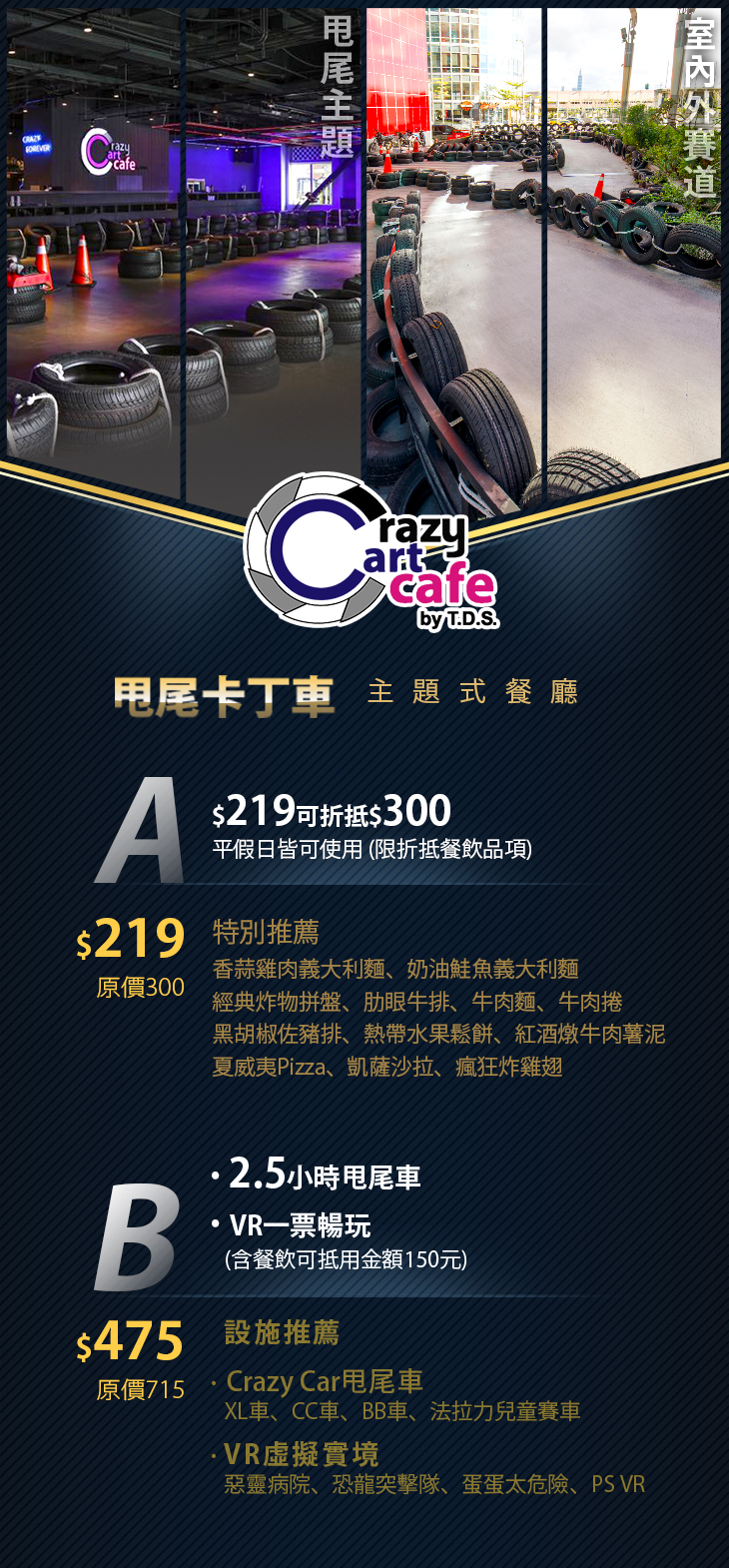 A.平假日皆可抵用300元消費金額(限折抵餐飲品項) / B.2.5小時甩尾車+VR一票暢玩(含餐飲可抵用金額150元)