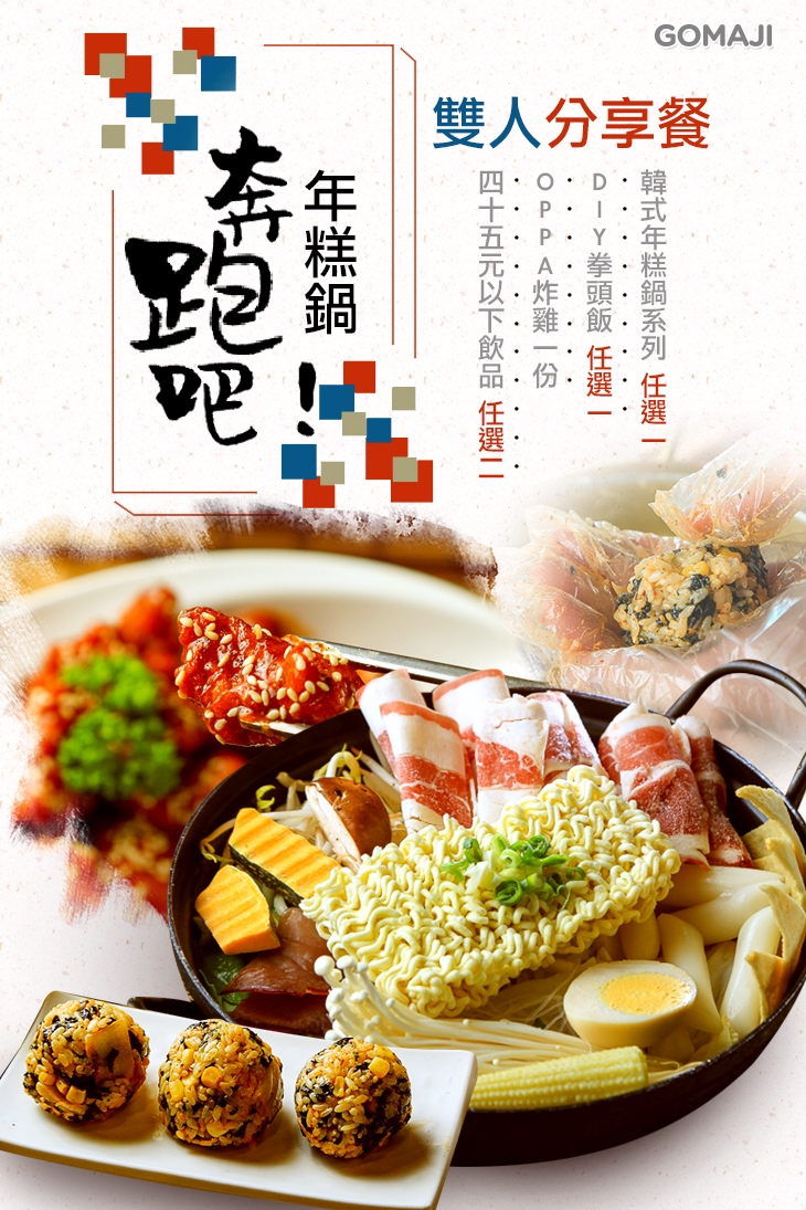 〈韓式年糕鍋系列任選一 + DIY拳頭飯任選一 + OPPA炸雞一份 + 45元以下飲品任選二〉