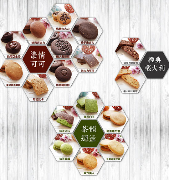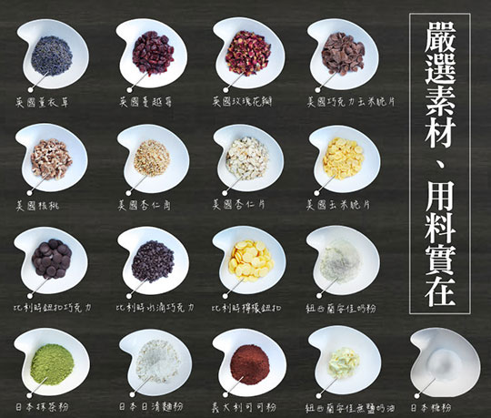 成份:日本抹茶粉、日本清麵粉、義大利可可粉、比利時鈕扣巧克力、比利時水滴巧克力、紐西蘭安佳無鹽奶油、比利時檸檬鈕扣、紐西蘭安佳奶粉、美國巧克力玉米脆片、日本糖粉、美國核桃、美國玉米脆片、英國薰衣草、英國蔓越莓、英國玫瑰花瓣、美國杏仁角、美國杏仁片