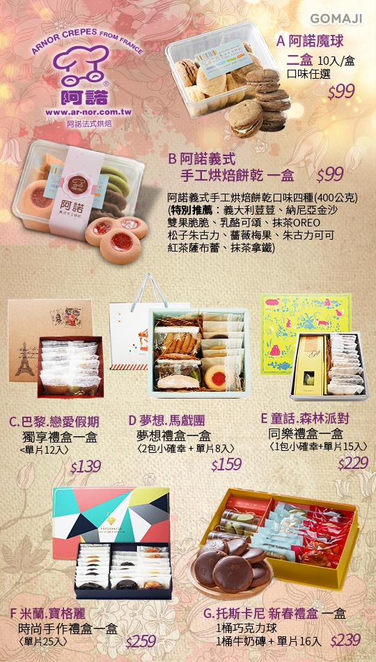 A.阿諾魔球二盒 / B.阿諾義式手工烘焙餅乾一盒 / C.巴黎.戀愛假期-獨享禮盒一盒 / D.夢想.馬戲團-夢想禮盒一盒 / E.童話.森林派對-同樂禮盒一盒 / F.米蘭.寶格麗-時尚手作禮盒一盒 / G.托斯卡尼新春禮盒一盒