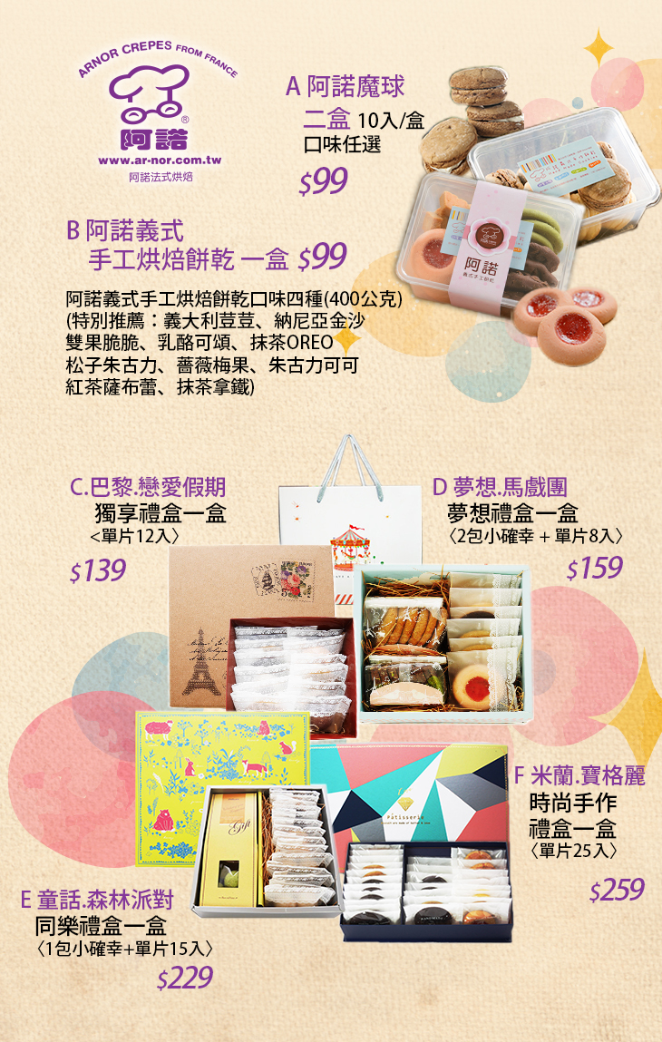 A.阿諾魔球二盒 / B.阿諾義式手工烘焙餅乾一盒 / C.巴黎.戀愛假期-獨享禮盒一盒 / D.夢想.馬戲團-夢想禮盒一盒 / E.童話.森林派對-同樂禮盒一盒 / F.米蘭.寶格麗-時尚手作禮盒一盒