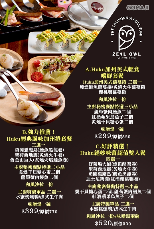 A.Huku加州美式輕食嚐鮮套餐 / B.強力推薦!Huku經典風味加州捲套餐 / C.好評精選!Huku絕妙味蕾超值雙人餐