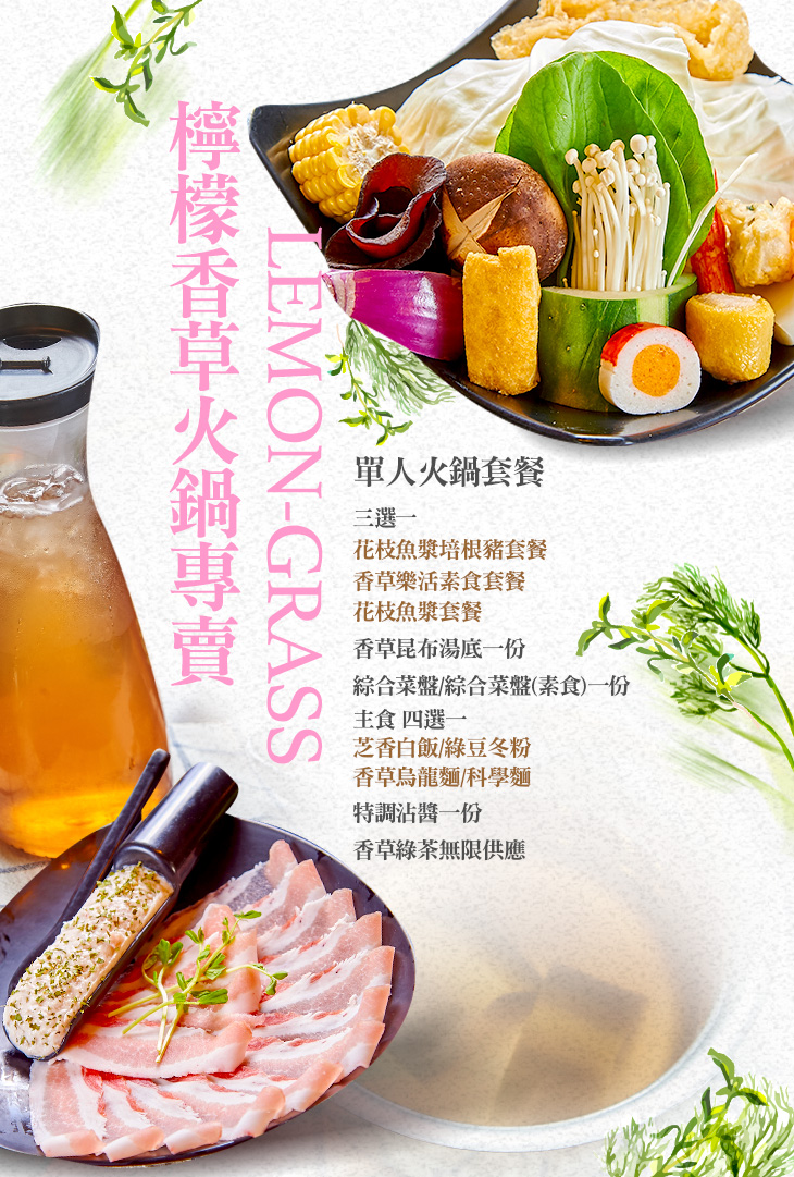 花枝魚漿培根豬套餐/香草樂活素食套餐/花枝魚漿套餐 三選一 + 香草昆布湯底 + 綜合菜盤/綜合菜盤(素食)一份 + 主食:芝香白飯/綠豆冬粉/香草烏龍麵/科學麵 四選一 + 特調沾醬一份 + 甜點:冬瓜檸檬凍一份 + 香草綠茶無限供應