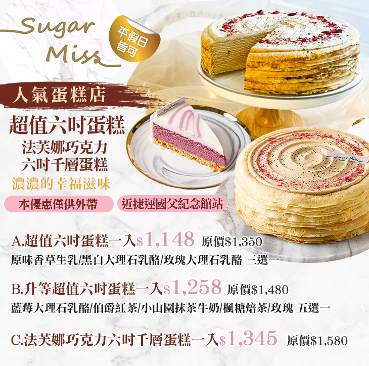 【Sugar Miss】更是認真製作每一份千層蛋糕,蛋皮厚度堅持維持為0.1至0.3mm,用心細膩地層層堆疊而上,完美交織而成精緻典雅的甜點,擁有入口即化的頂級享受,帶給味蕾最難忘的悸動。