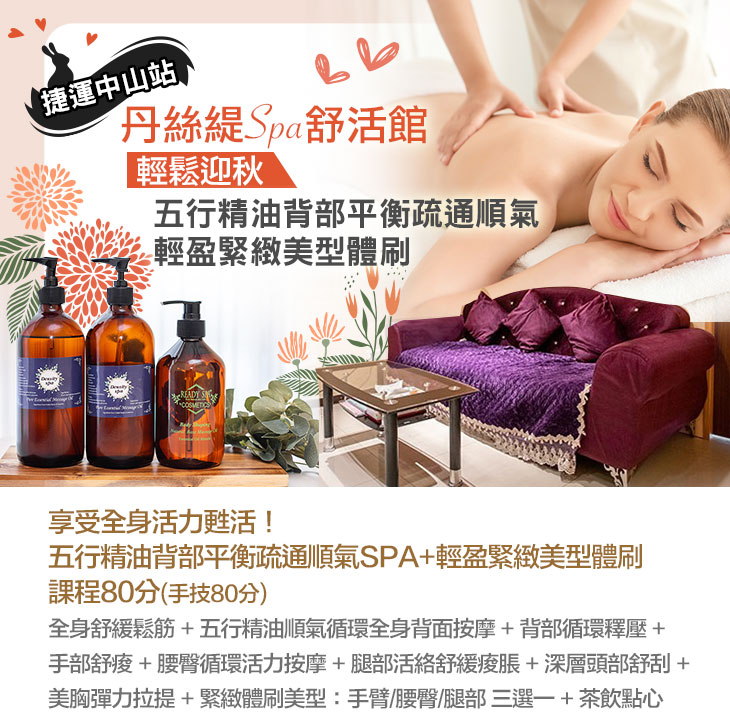 ★ 享受全身活力甦活!五行精油背部平衡疏通順氣SPA+輕盈緊緻美型體刷課程80分(手技80分)