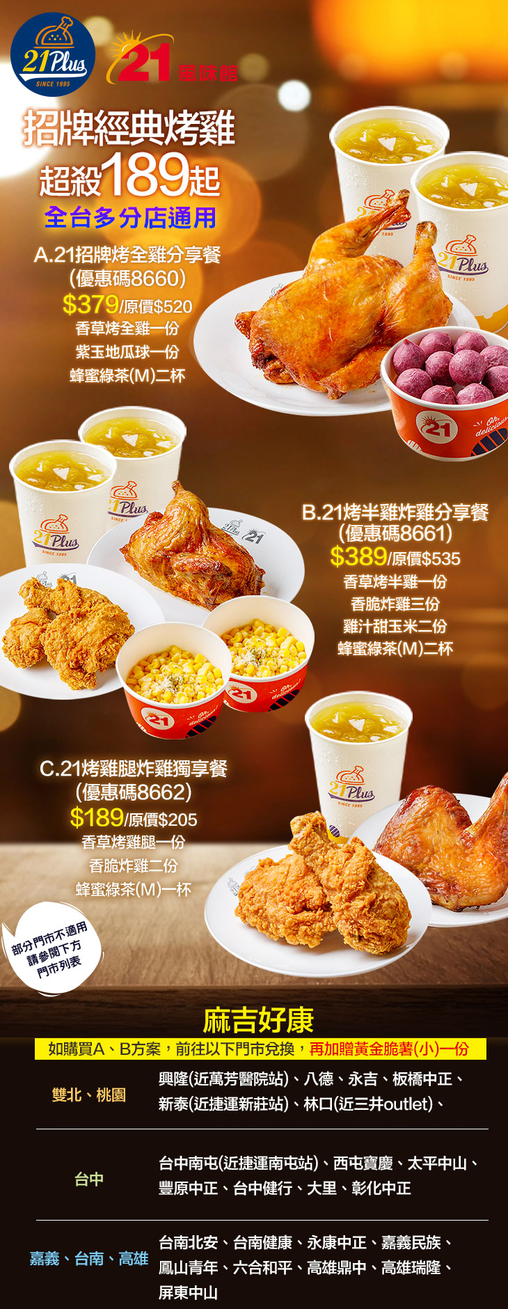 A.21招牌烤全雞分享餐(優惠碼8660) / B.21烤半雞炸雞分享餐(優惠碼8661) / C.21烤雞腿炸雞獨享餐(優惠碼8662)