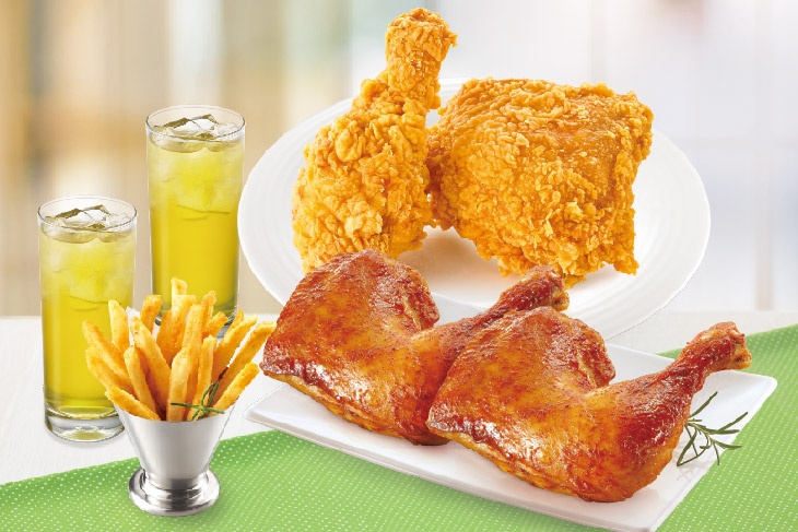 B.烤雞炸雞雙人餐(優惠碼2325)〈香草烤雞腿二份 + 香脆炸雞二塊 + 中薯霸一份 + 蜂蜜綠茶(M)二杯〉