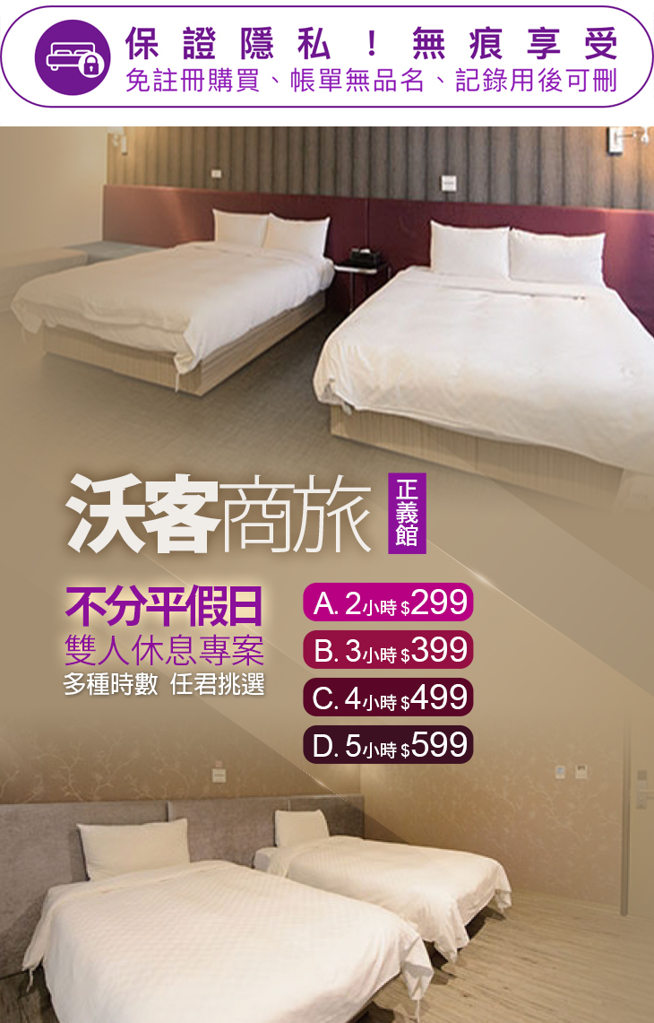 沃客商旅 正義館以「提供旅客經濟實惠的住宿價格、體驗小而美的優質客房、享受專業的旅遊諮詢、感受全方位的貼心服務」為營運宗旨,讓旅客享受生活風格的美好幸福。