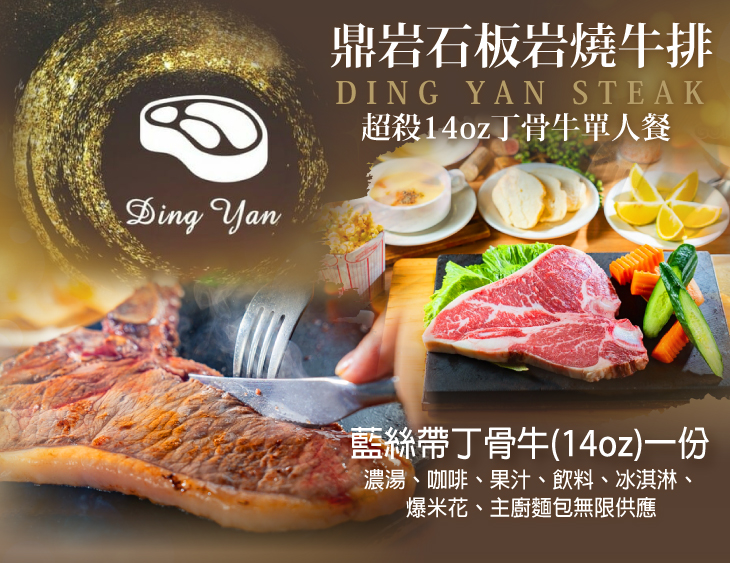 〈藍絲帶丁骨牛(14oz)一份 + 濃湯、咖啡、果汁、飲料、冰淇淋、爆米花、主廚麵包無限享用〉