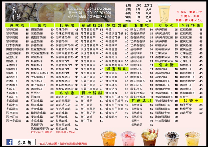 特別推薦:水果茶、四季春青茶、咖啡冬瓜、脆梅青QQ、黑糖鮮奶珍珠、桂花釀金萱、檸檬玫瑰花釀、金桔綠茶