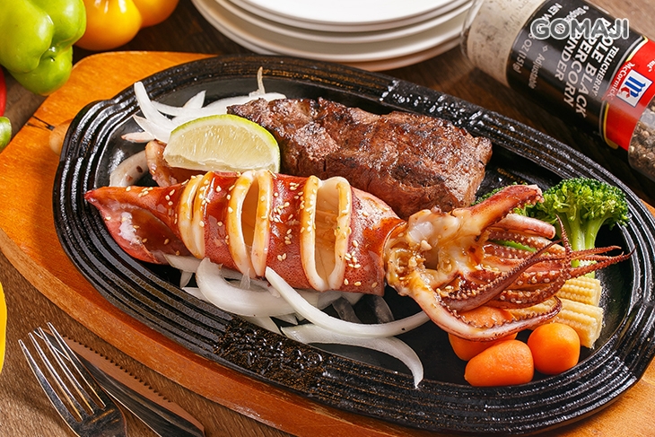海陸雙拼一次滿足您的味蕾!嚴選深海魷魚,甜潤柔滑,鮮甜氣息瞬間迷煞眾人的心!搭配渾厚多汁的美國霜降牛排,牛排表面帶著些許焦香,內層保持原汁原色原味,熟度保持住最彈牙有脆度的口感,油花相間分布均勻,肉質更顯鮮嫩,風味極佳,一端上桌便香氣十足,每吃一口都帶著肉汁,海陸美味皆能讓人陶醉其中!