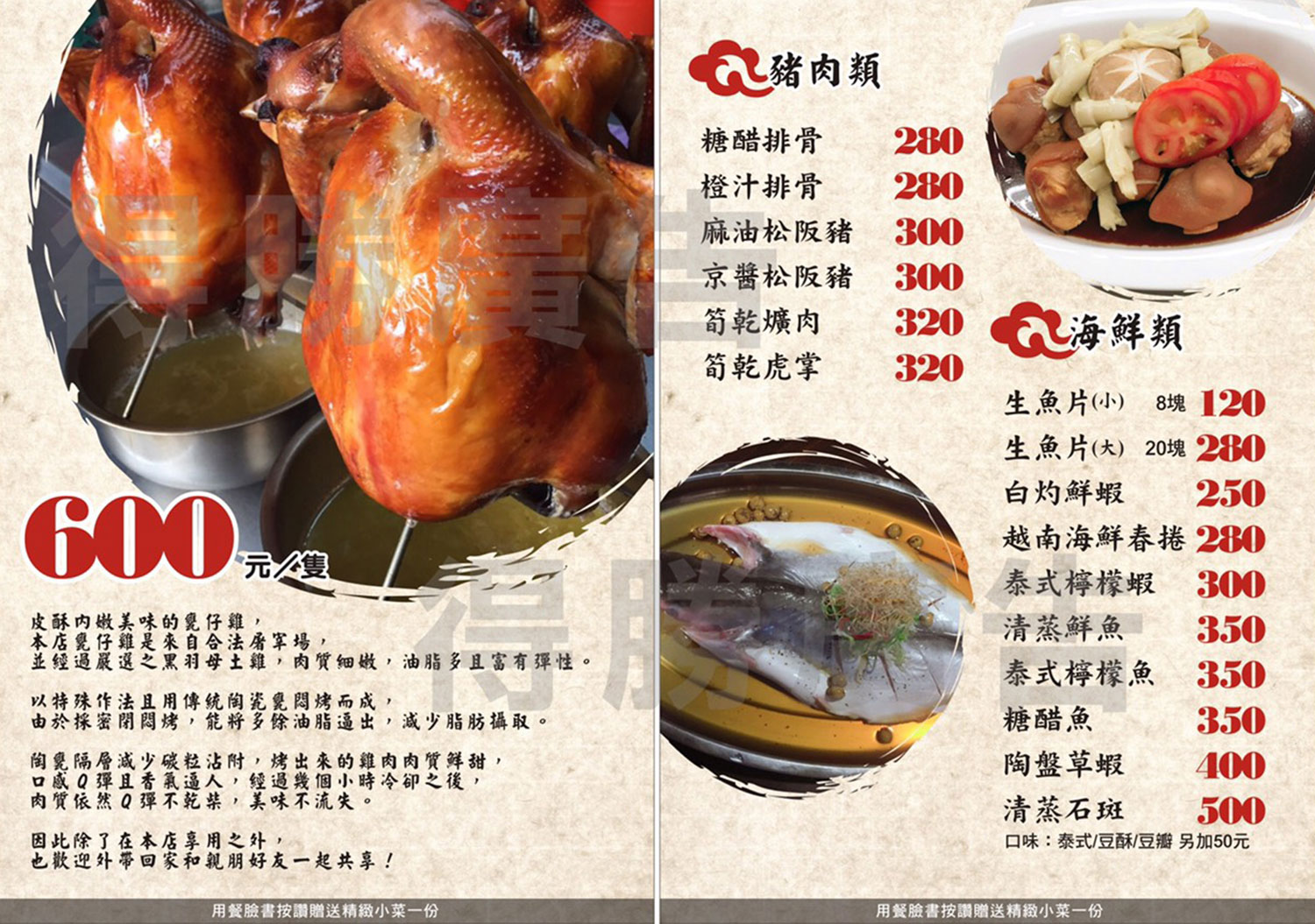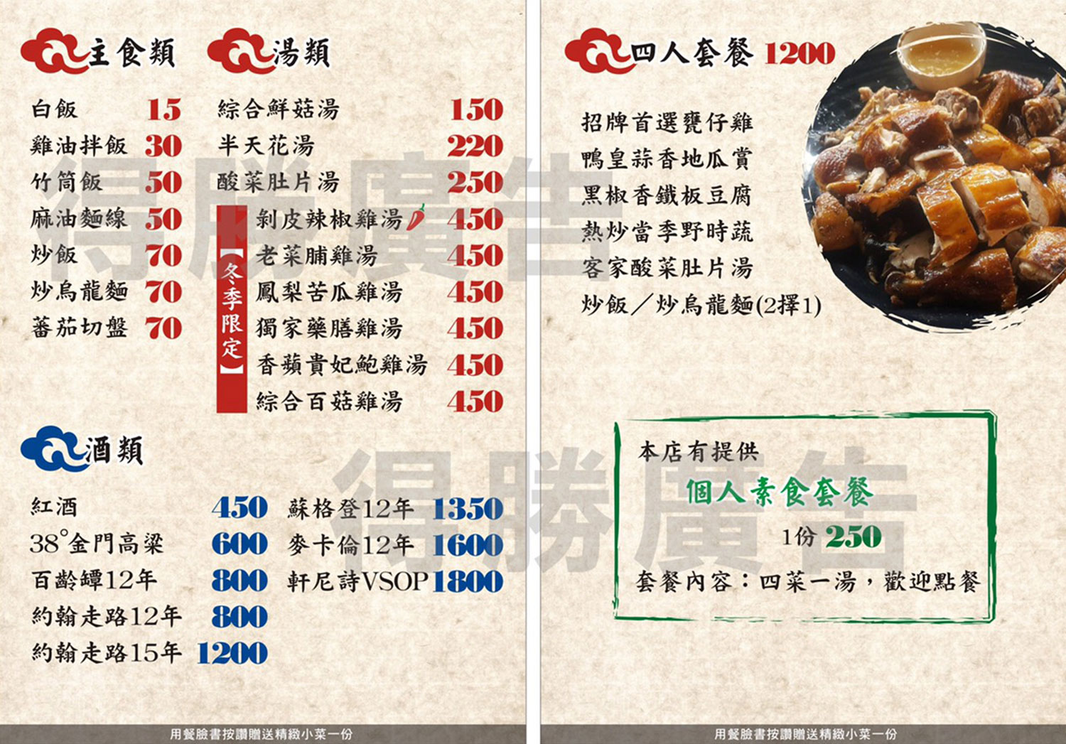 本店甕仔雞是來自合法屠宰場,皮酥內嫩美味的甕仔雞,並經過嚴選之黑羽母土雞,肉質細嫩,油脂多且富有彈性。以特殊作法且用傳統陶甕悶烤而成,由於採密閉悶烤,能將多餘油脂逼出,減少脂肪攝取。陶甕隔層減少碳粒沾附,烤出來的雞肉肉質鮮甜、口感 Q 彈且香氣逼人!經過幾個小時冷卻之後,肉質依然 Q 彈不乾澀,美味不流失。因此除了可以在本店享用外,也歡迎外帶回家和親朋好友一起共享!