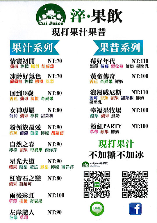 ▶ Cui Juice 淬果飲 現打果汁果昔 ◀ 今年最流行的飲料風潮! 瓶裝飲料.漸層飲料.繽紛果汁.少女心果昔 位於板橋三猿廣場一樓,新鮮現打果汁果昔, 不加糖、不加冰,愛與用心是永遠不變的添加,給您原汁原味的好滋味!光看這美麗繽紛的色澤就覺得好滿足,每一口都有充滿層次的豐富口感更是迷人! 莓好年代/幸福果牧場 粉紅PARTY/回到18歲 紅寶石之戀