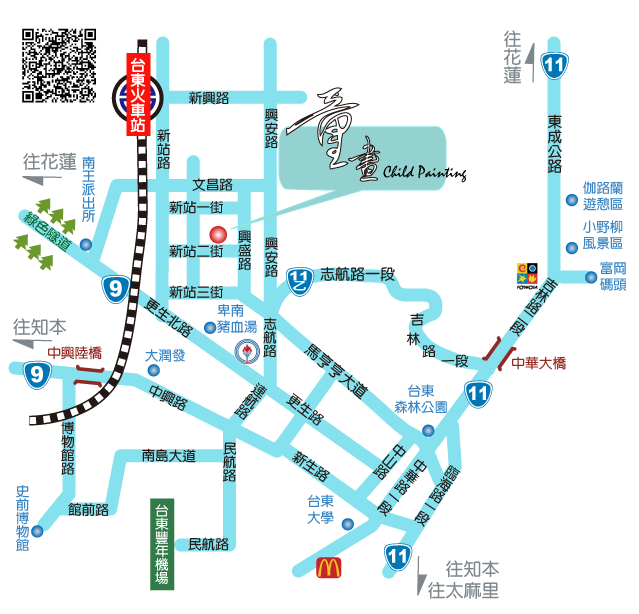 花蓮 → 台東(台九線) → 沿更生北路行駛 → 左轉志航路 → 興安路 → 左轉文昌路 → 左轉新站路 → 左轉新站二街 → 童畫