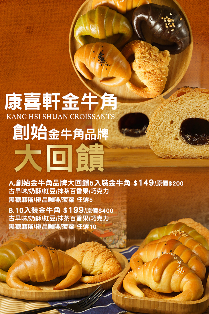 風靡大街小巷的人氣美食!這檔錯過,絕對讓您直呼可惜喲!在台擁有眾多分店的【康喜軒金牛角】,希望顧客從「認識金牛角」、「相信金牛角」到「愛上金牛角」,因此不斷改良產品品質,強調健康與衛生。抱持著「用心」、「愛心」、「專心」、「良心」這四心生產店內每項產品,不惜成本堅決使用法國進口發酵奶油、加拿大小麥以及100%乳品製作口味獨特的金牛角牛角麵包。康喜軒將在地的三峽老街文化融入到包裝禮盒中,讓每個來到三峽老街的遊客品嚐到口感獨特的金牛角之外也能進而了解三峽老街的文化與故事。