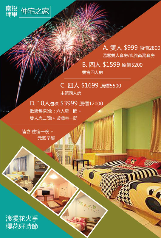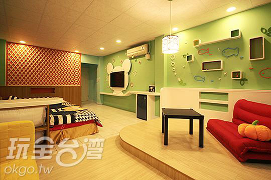 仲宅之家備有雙人房、四人房和基本可容納十人的包棟服務。以繽紛的鮮豔色彩為基底,運用可愛的裝潢佈景並融入卡通主題,打造出歡樂的度假氣息,提供旅人們一處得以完全放鬆、安心休息的溫馨家居場所。
