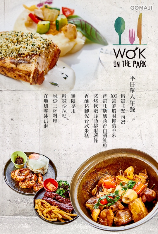 Wok on the Park 不只是單純吃飯的地方,看窗外綠意延伸進入多彩新穎的用餐環境,輕鬆的氛圍讓您和親友的相聚時光充實愉快,推薦您在茶餘飯後之際,到英迪格獨有的私享空間 Me Space 小憩或激發想像,歡迎呼朋引伴來公園裡的 Wok 野餐!