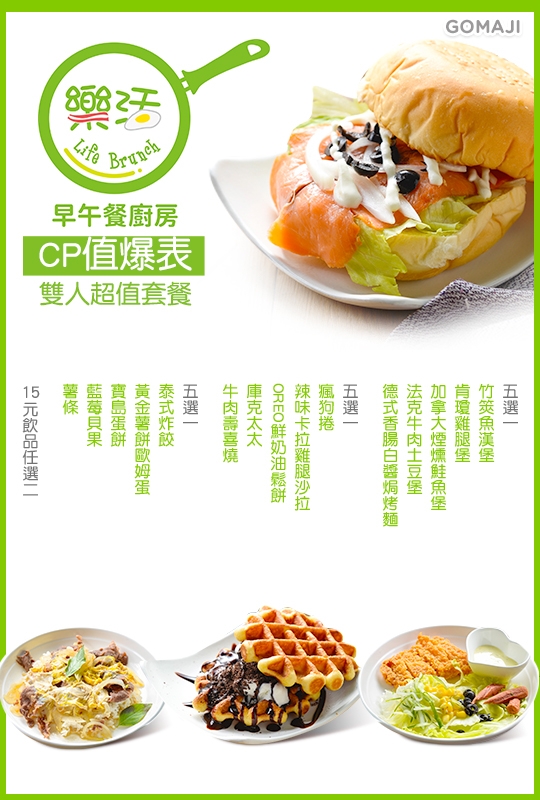 竹筴魚漢堡/肯瓊雞腿堡/加拿大煙燻鮭魚堡/法克牛肉土豆堡/德式香腸白醬焗烤麵 五選一 + 瘋狗捲/辣味卡拉雞腿沙拉/OREO鮮奶油鬆餅/庫克太太/牛肉壽喜燒 五選一 + 泰式炸餃/黃金薯餅歐姆蛋/寶島蛋餅/藍莓貝果/薯條 五選一 + 15元飲品任選二