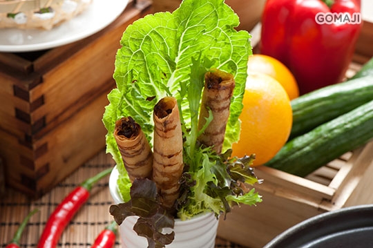 將筍絲、金針菇、杏鮑菇炒熟成餡,再將春卷皮鋪滿餡料捲起,炸成金黃色,再加上義式巴沙米可醋,搭配生菜一起享用,或沾上日式胡麻醬汁,香而不膩,極為酥脆。