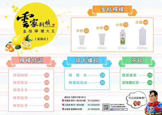 位於南高雄青年路國民市場的老字號雲家檬檬大王由雲利禎老先生,創立於1961年!從年輕時候不斷研發各種小吃,除了本著自身對食物的熱情,也因為多了創意及勇於嘗試的精神,經過不斷的試驗改良精進、最後研發出檸檬汁結合金桔(ㄐㄧㄝˊ)搭上獨家配方的砂糖漿,創造出人人愛不釋口的金桔檸檬汁,也就是高雄人都熟悉的青年路國民市場-雲家檸檬大王。「常喝一杯檸檬汁 還你青春二十年」雲老先生經常以標語廣宣方式,結合擅長的毛筆書寫來提醒顧客檸檬對身體健康的重要性。現在我們來到凹子底這邊繼續推廣 並改名為(雲家利禎) 堅持每天使用新鮮的金桔檸檬現壓原汁做為調飲,並增加其它檸檬飲品相關選項,多元化的經營讓更多朋友知道檸檬對身體的好處,在末來我們將持續對這份傳統口味的堅持,最在地的口味- 雲家利禎金桔檸檬大王!