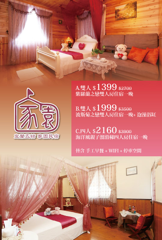 美麗的宜蘭田園風光陪您共享難得的假期時光,在大自然花草的陪伴下,讓人有放鬆心情自然湧出一種幸福的感覺。“家園”的溫暖、放鬆愉悅、質樸不做作,拉近人與人的距離、貼近自然。