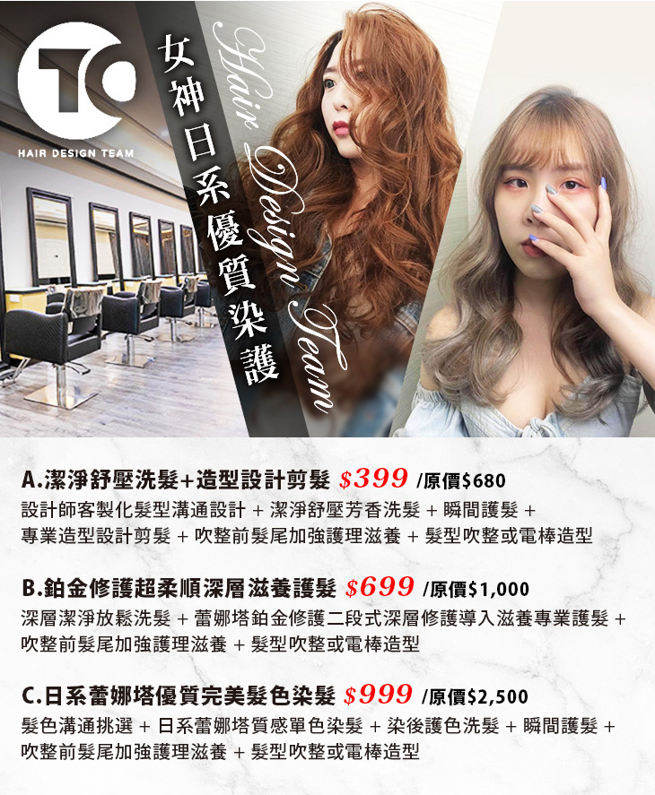 特別採用頂級的髮品與染劑,由設計師的專業操作、獨到美感,替秀髮均勻上色,染後效果持久,色彩飽滿、髮絲柔順,讓您走到哪都瞬間成為矚目焦點!