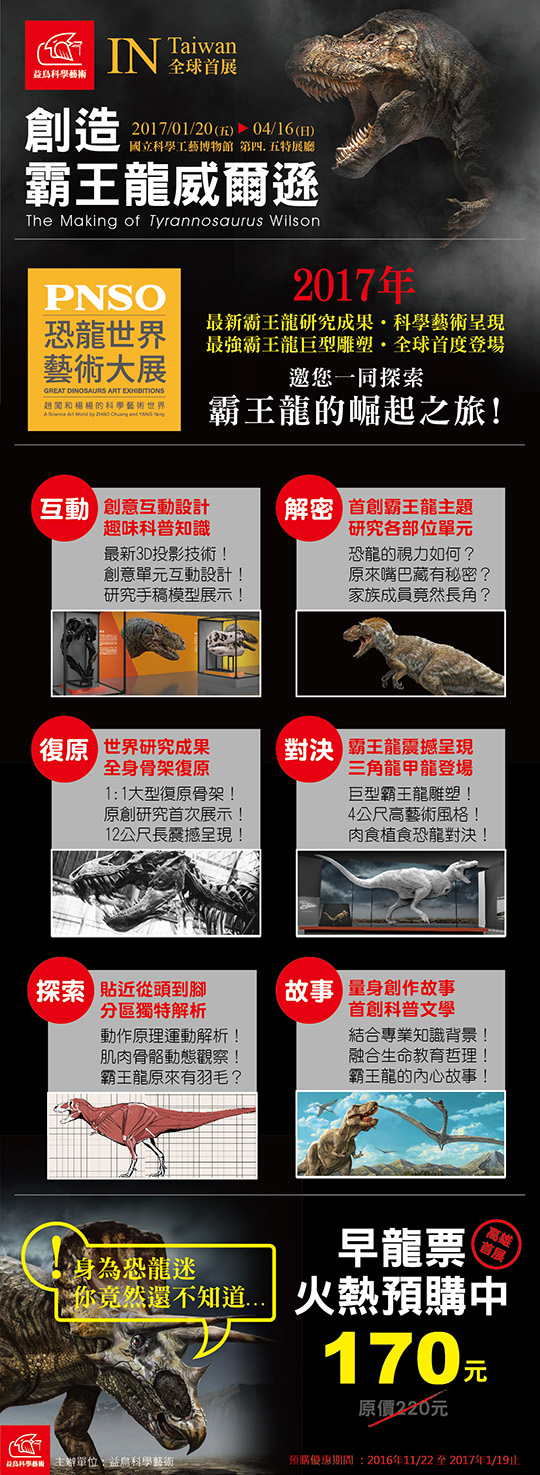 【創造霸王龍威爾遜 恐龍世界藝術大展】是世界首度以霸王龍為主題的特展,呈現霸王龍的最新考古研究,創造出史上最完整的霸王龍復原!帶來科學、藝術、文學的跨界結合!