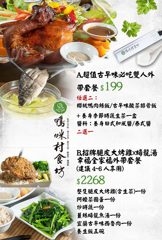 嚴選肥嫩多汁的雞隻,搭配獨門醃製配方及精準掌握出爐時間而成,外皮鹹香酥脆,呈現迷人油潤的焦糖色澤,令人垂涎欲滴~淺嚐一口,如此自然鮮醇的口感,簡直一口銷魂!細嫩肉質散發鮮美至極的甜味,精華底蘊在齒頰間久留不散,讓人一口接著一口停不下來!【鴨咪村古早味食坊】最引以為傲的專屬美味,身為老饕的您千萬別錯過!