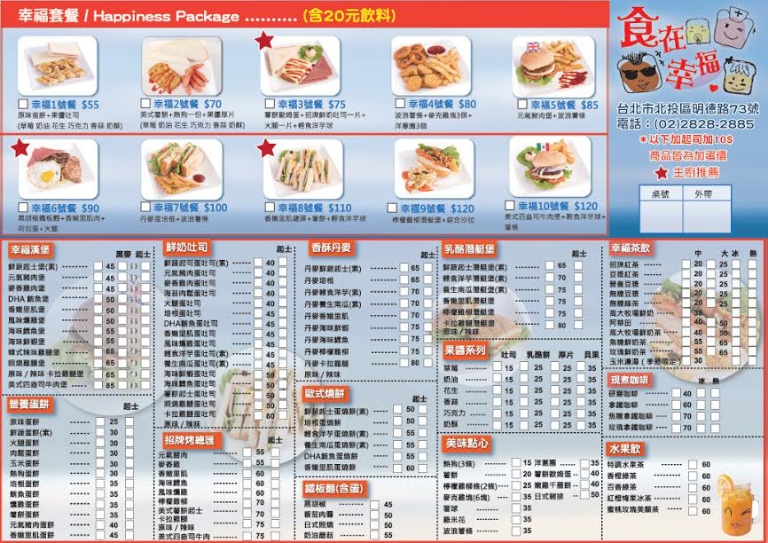 位於台北市北投區明德路 73 號 1 樓的食在幸福,鄰近捷運明德站,交通還算方便,專營新鮮美味的活力餐點,希望用心手作的每一道餐點能夠喚醒你我對美食最初的渴望,藉由分享美食,傳遞心中的愛,讓我們所在的這片天空能擁有更多的溫暖,這,就是〝食在幸福〞。